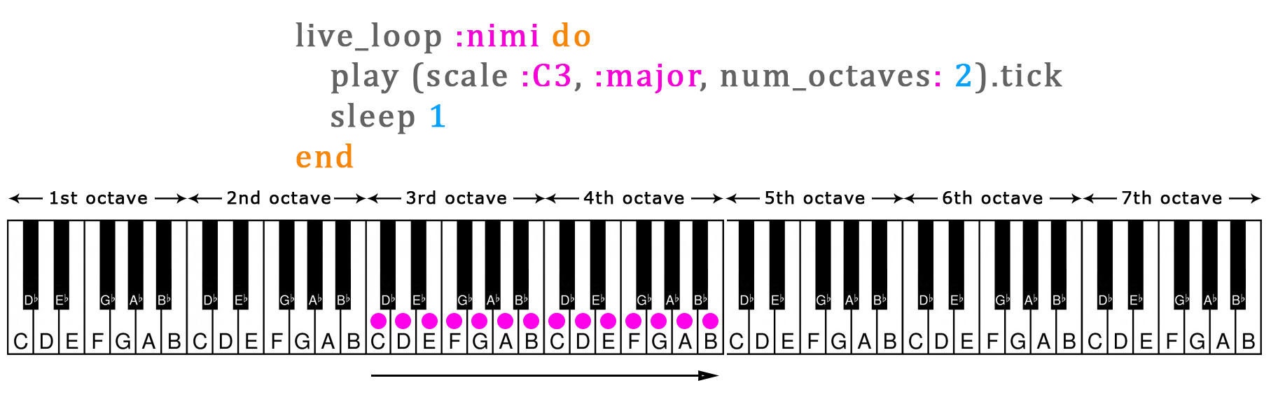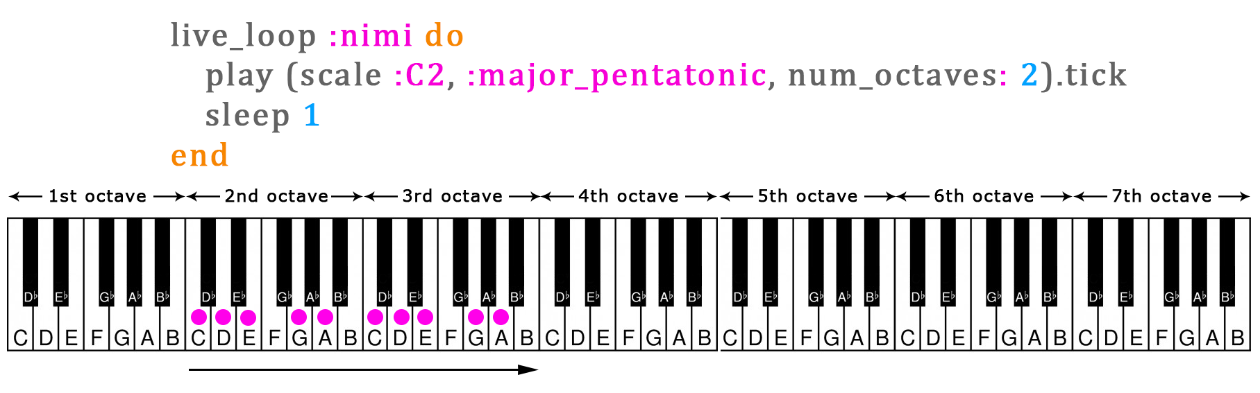 scale(:c2, :major) # ring of :c2, :d2, :e2, :f2, :g2, :a2, :b2 chord(:c2, :major, , num_octaves: 2) # ring of :c2, :e2, :g2 :c3, :e3, :g3