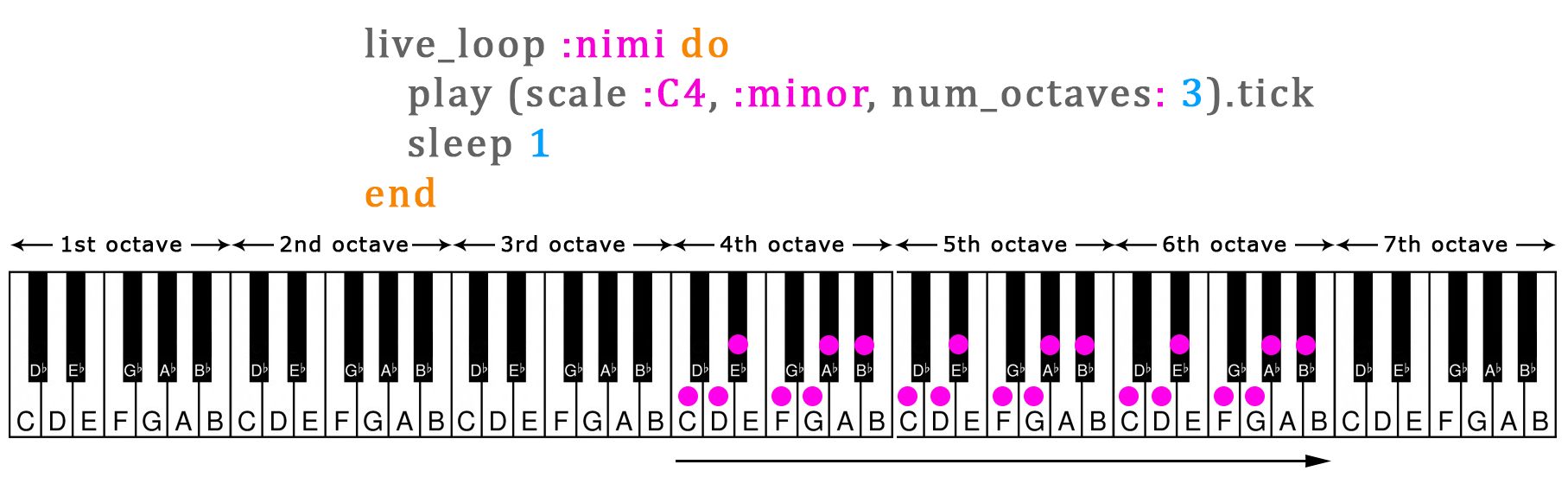 play scale(:e3, :minor_pentatonic).tick, release: 0.1